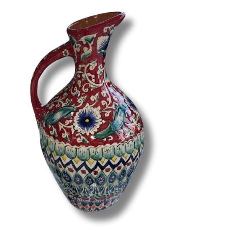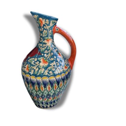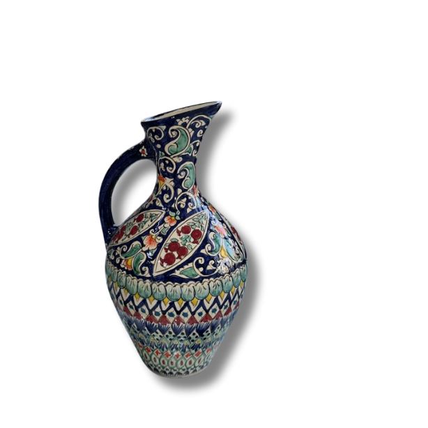 Özbək naxışları ilə bəzədilmiş su qabı — həm dekorativ, həm də gündəlik istifadə üçün ideal seçimdir. Əl işi detalları və rəngli ornamentləri ilə mətbəxinizə xüsusi bir estetik qatır. Su, şərbət və digər içkilərin təqdimatı üçün uyğundur. Davamlı materialdan hazırlanıb və qida ilə təmas üçün tam təhlükəsizdir.